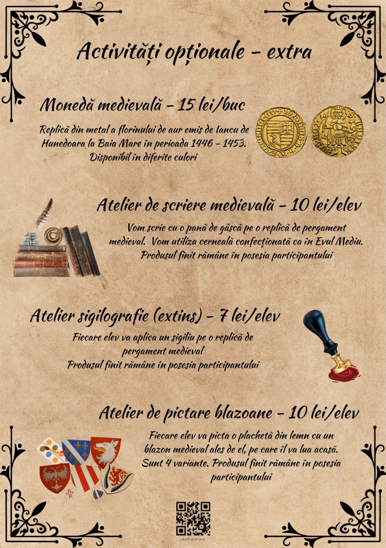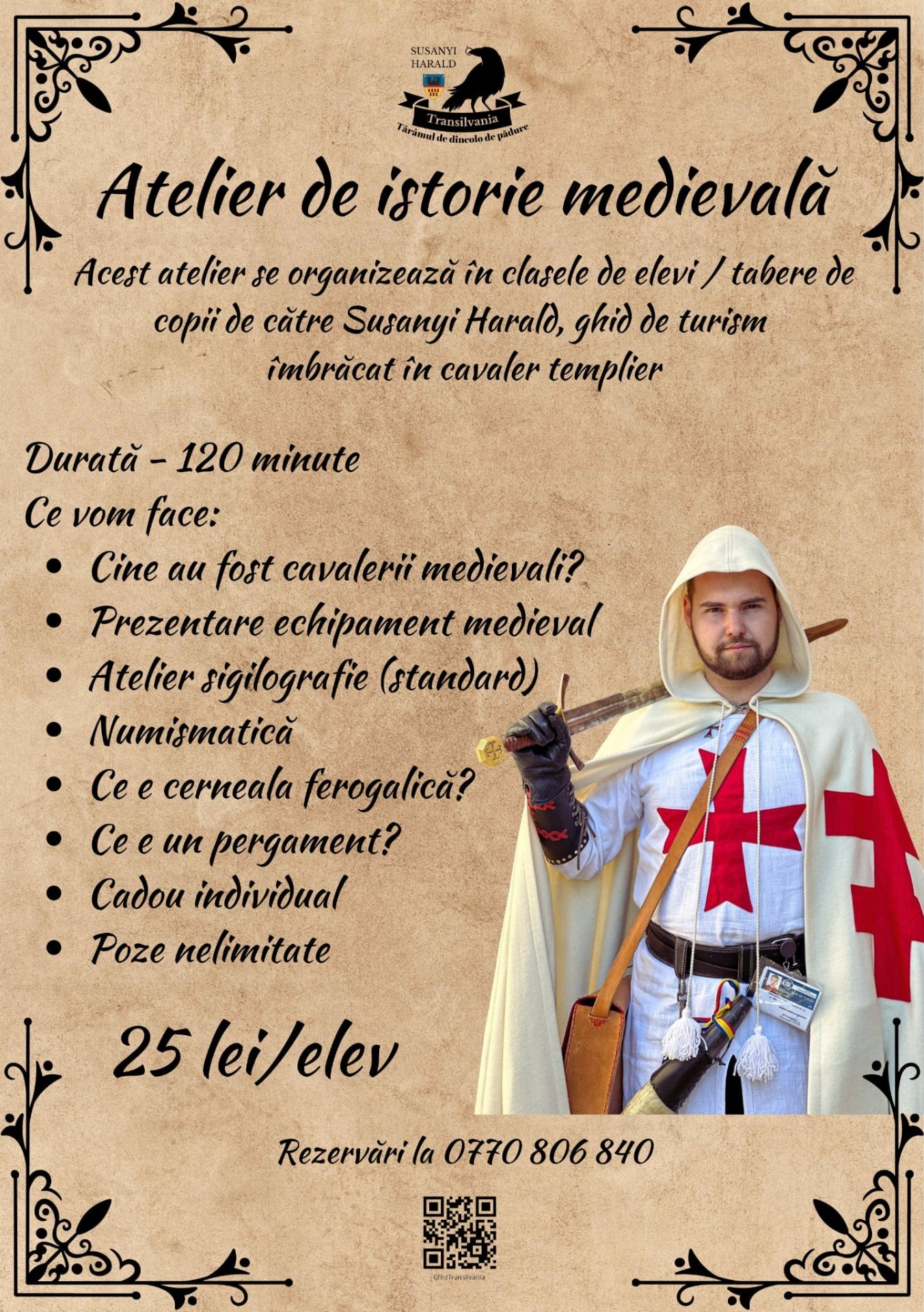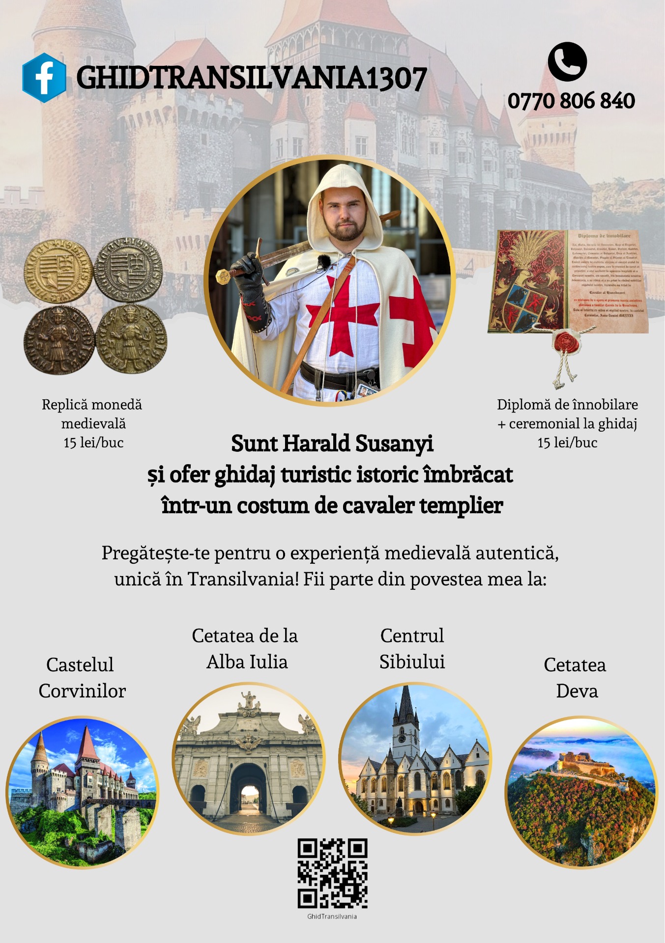 Vă invit la o călătorie de neuitat prin Transilvania alături de un ghid costumat într-un cavaler templier! Așa este, ați citit bine. Pe parcursul ghidajului mă voi prezenta în fața dvs îmbrăcat într-un cavaler templier pentru a crea o atmosferă istorică deosebită.
