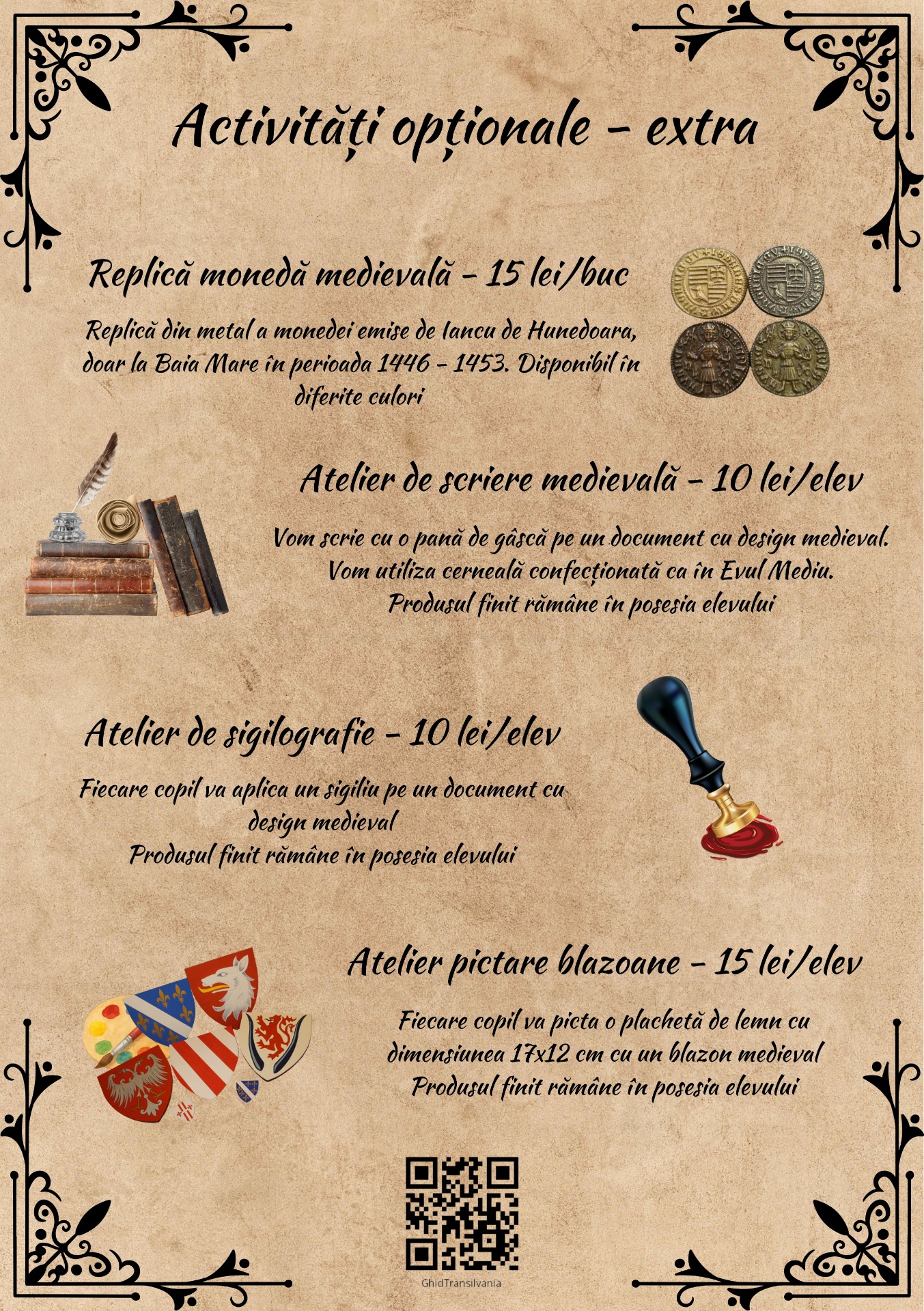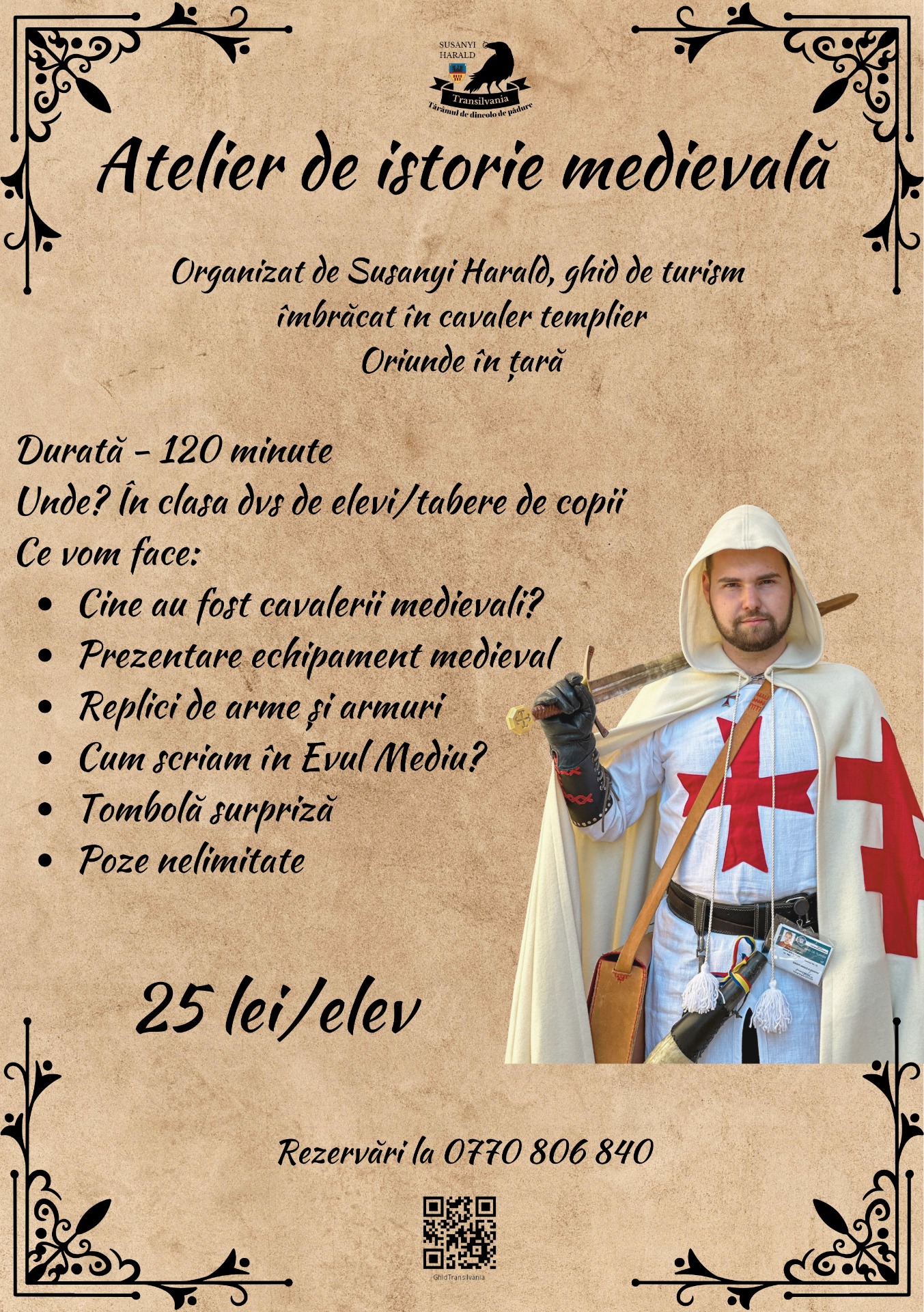 Fac ateliere de istorie medievală, fizic, la clasă, îmbrăcat în cavaler medieval + alte surprize. Este o activitate interesanta pentru săptămâna Altfel sau Verde și durează aproximativ o oră. Este recomandata claselor primare sau de gimnaziu, dar nu i-ar plictisi nici pe liceeni